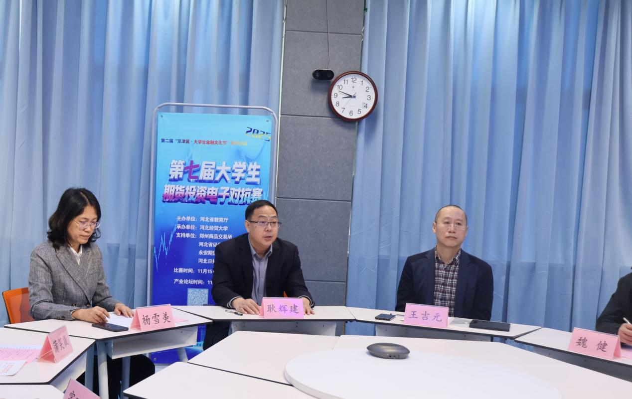 11月15日,作为第二届 “京津冀·大学生金融文化节” 系列活动之一,第七届大学生期货投资电子对抗赛在我校圆满落幕。本次大赛由河北省教育厅主办、我校承办,永安期货股份有限公司、郑州商品交易所、河北省证券期货业协会等单位提供了指导支持。校党委常委、副校长耿辉建出席开幕式并致辞,来自北京物资学院、河北师范大学、永安期货、河北岭石网络科技、浙江物产永利实业、河北省证券期货业协会等单位的高校和业界专家,学校教务处及9778818威尼斯相关领导教师,各高校指导教师及参赛选手通过线上线下形式参与活动,威尼斯官网院长杨雪美主持开幕式。