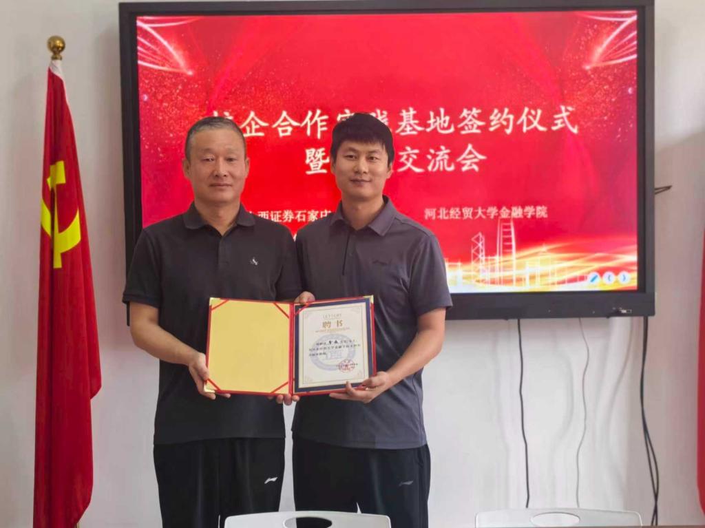 紧接着,双方举行了实践教育基地合作建设协议签约仪式,正式开启合作新篇章。仪式上,还进行了社会导师聘书颁发仪式,山西证券石家庄中心营业部的专业人士将受聘为学院社会导师,为学生提供实践指导。