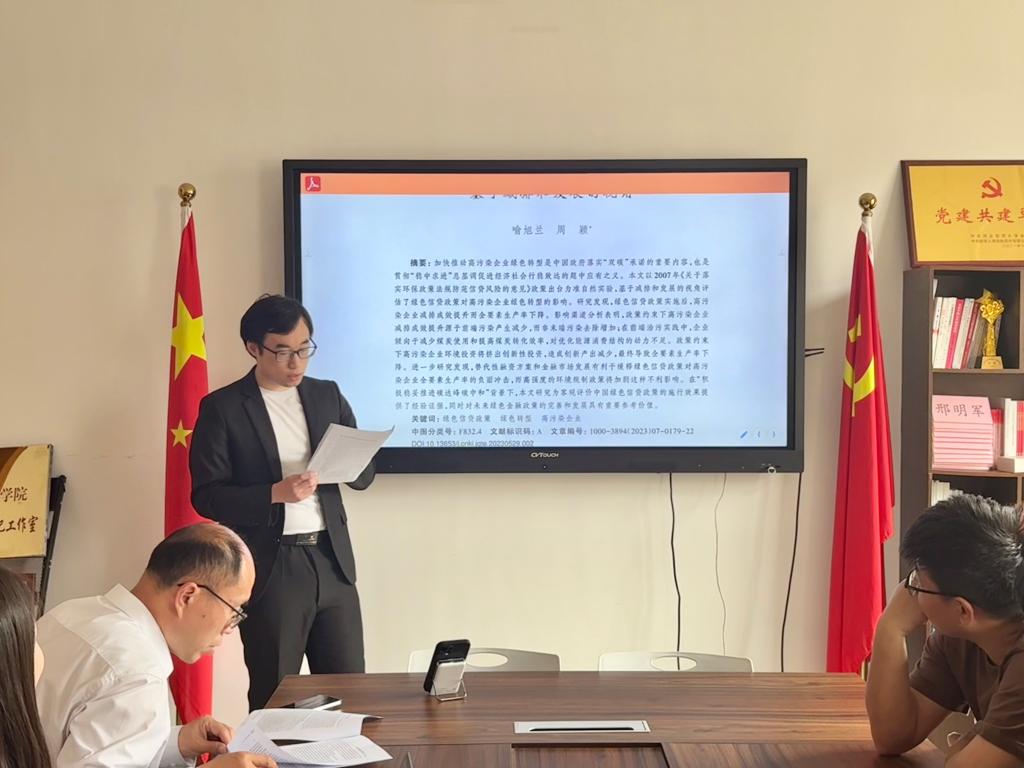 杜朋毅同学以2007年相关政策出台为准自然实验,分析发现绿色信贷政策显著提升了高污染企业的减排成效,但也导致其全要素生产率下降,且企业更倾向减少煤炭使用而非优化能源结构,环境投资也挤占了创新性投资。范庆祝副院长点评该论文时指出,研究紧扣时代脉搏,方法严谨,结论有深度,对绿色金融政策评估有重要参考价值,同时建议同学们在论文写作过程中要仔细严谨,不断提升自身的科研能力。