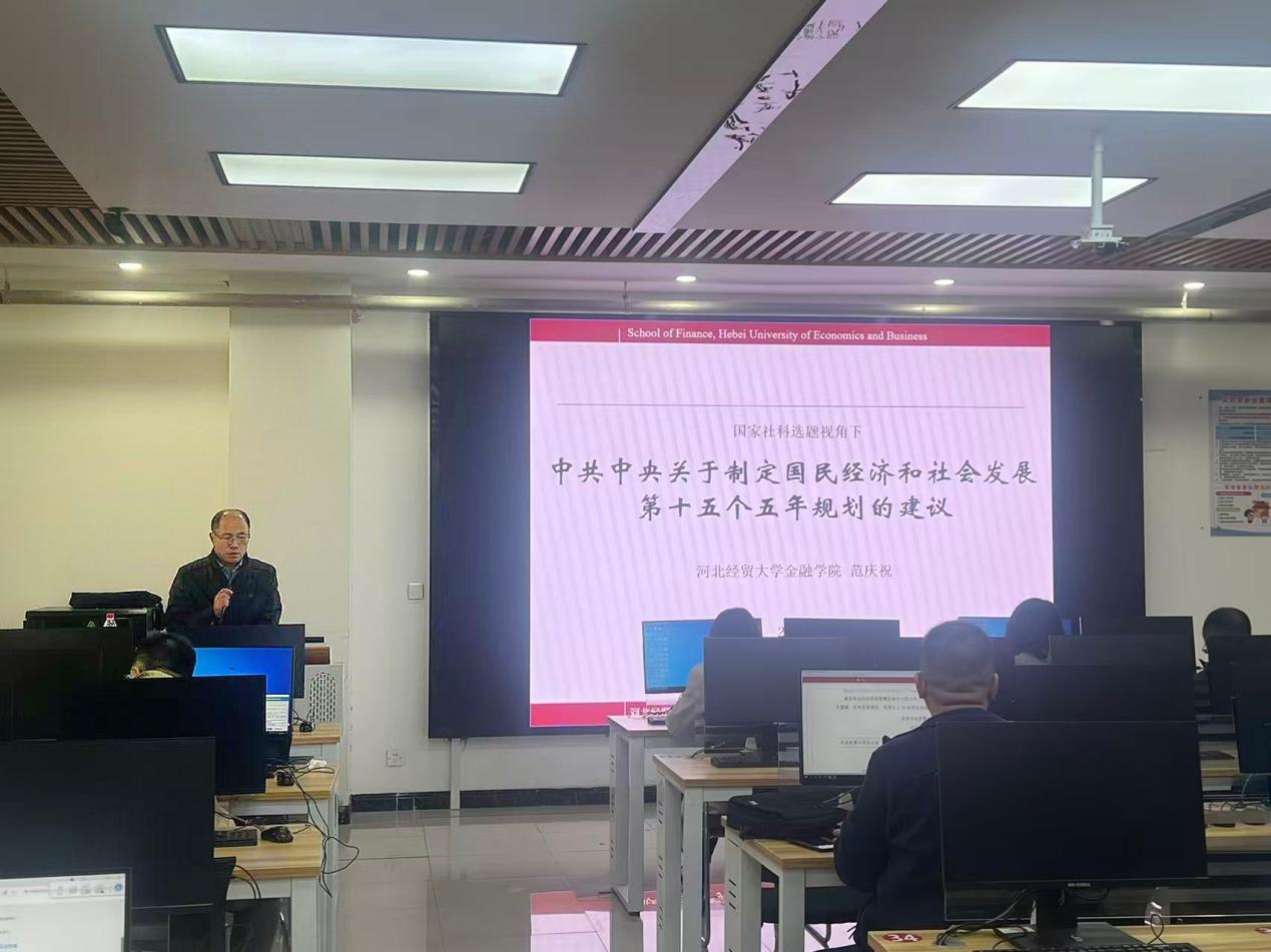 为精准把握国家中长期发展战略方向,切实提升威尼斯官网教师国家社科基金等高级别课题的申报质量与立项率,近日,9778818威尼斯成功举办了“2026年国家课题申报辅导(第四期)”活动。本期辅导会由金融学院副院长范庆祝作“国家社科选题视角下《中共中央关于制定国民经济和社会发展第十五个五年规划的建议》(以下简称《建议》)”专题报告,深度解读《建议》的核心要义与选题导向,学院领导班子及全体教师参加了本次学习交流。